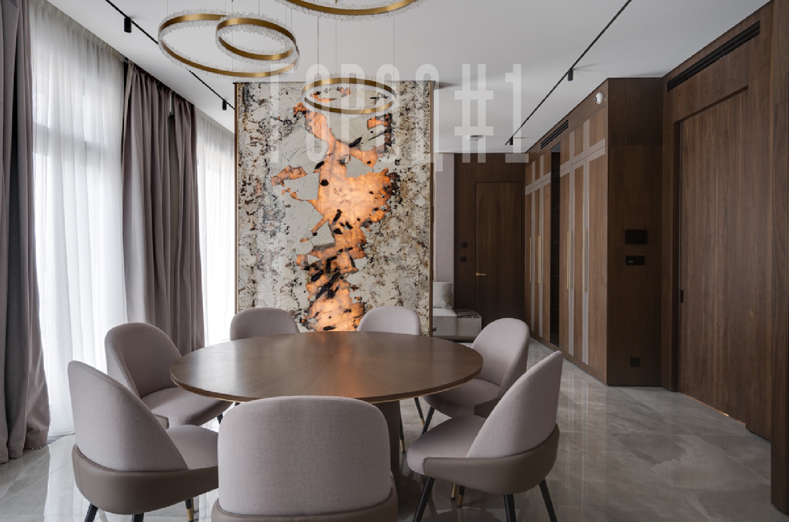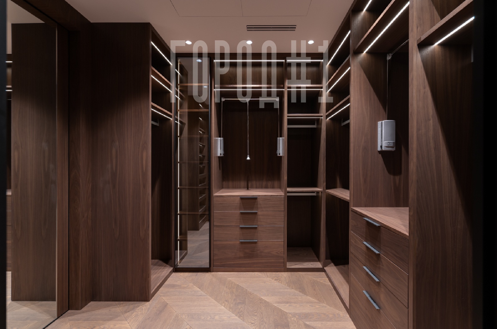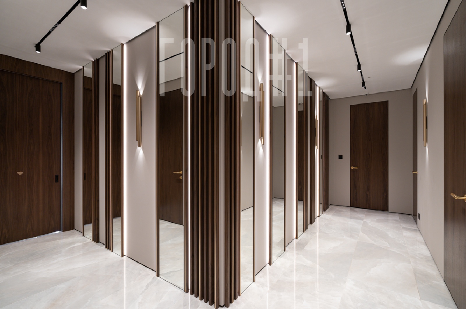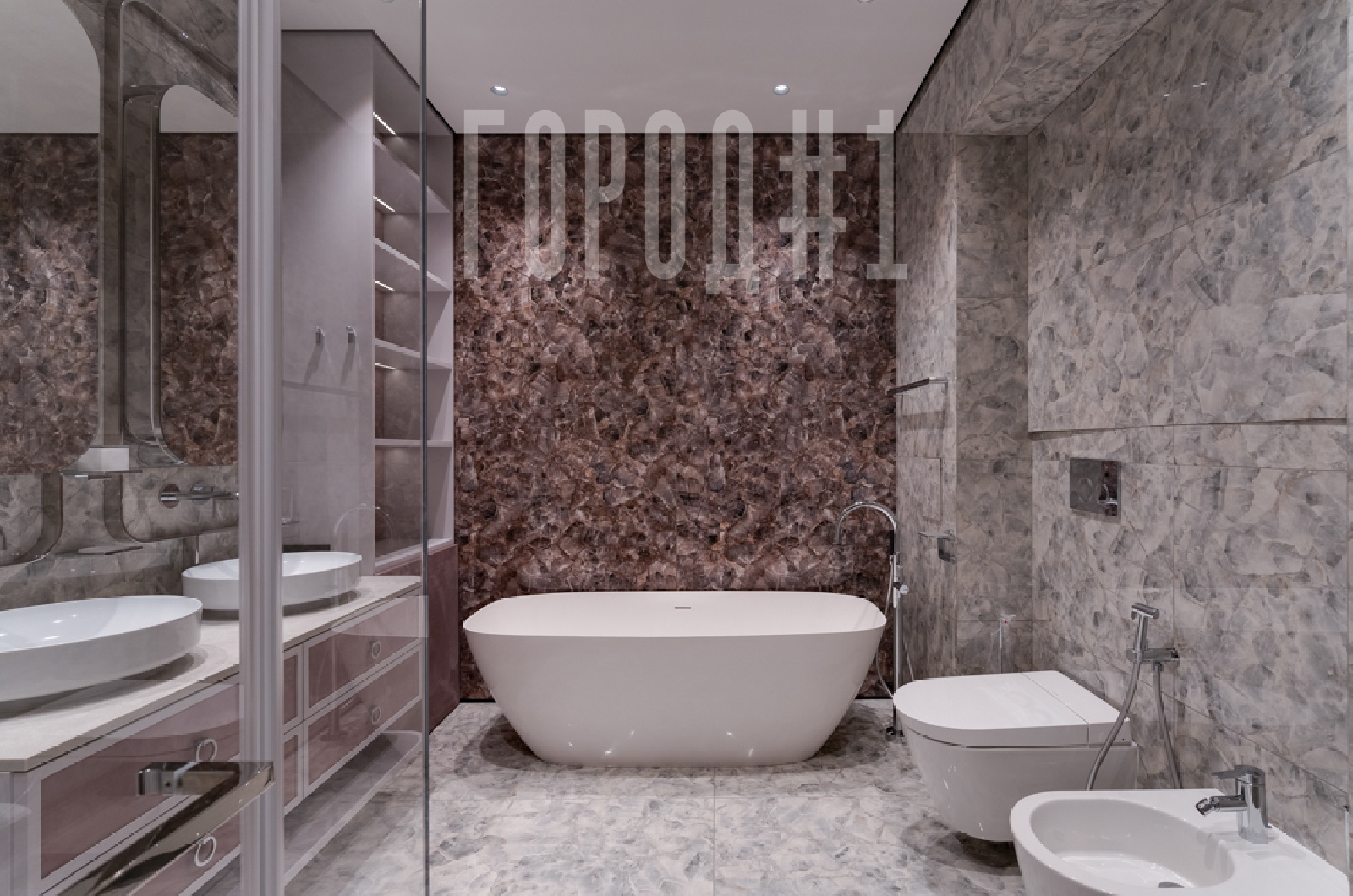 Планировка: кухня-столовая-гостиная, мастер-спальня с с/у и гардеробной, детская с с/у, спальня и кабинет, гостевой с/у, постирочная, гардеробная.