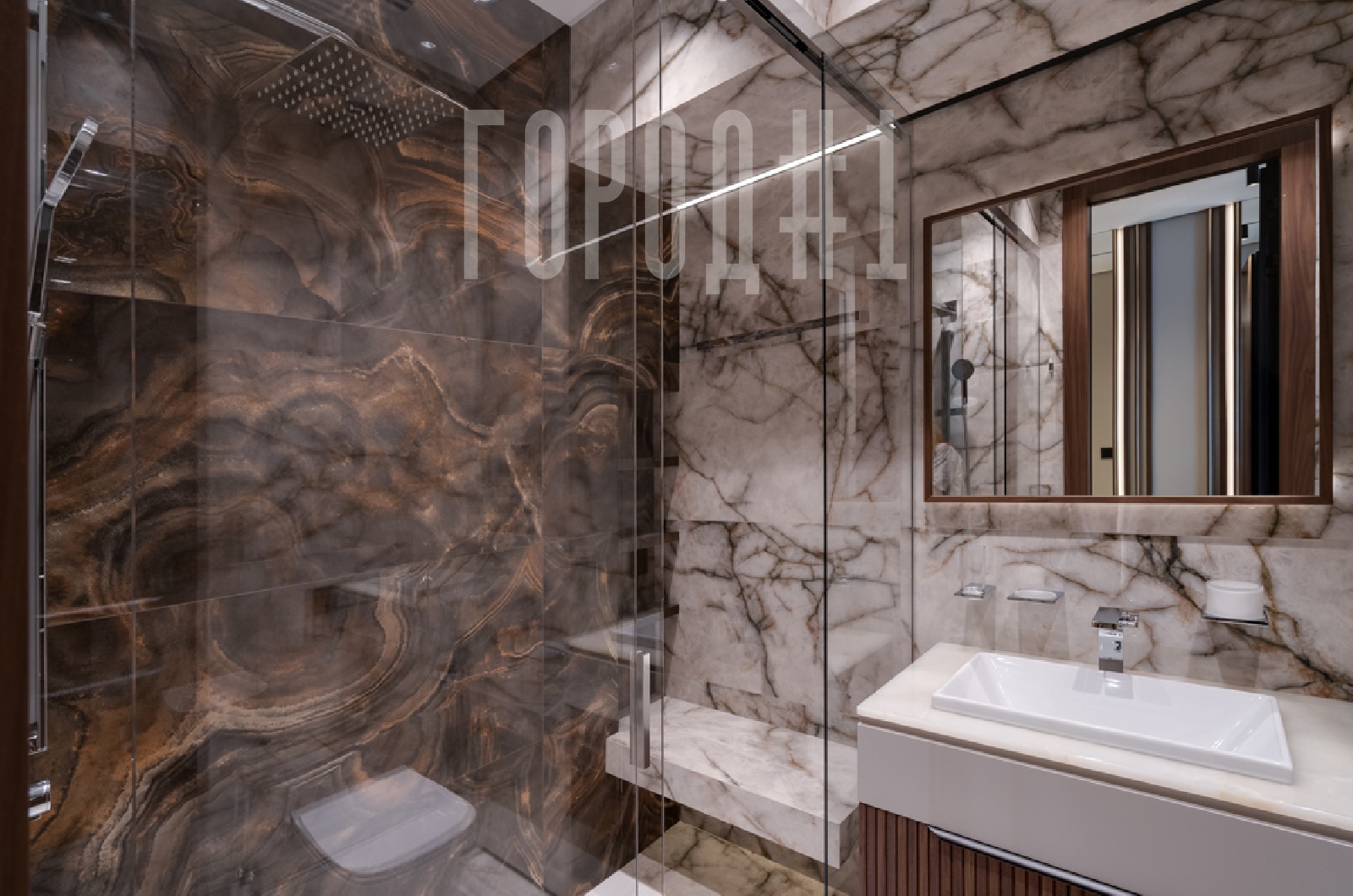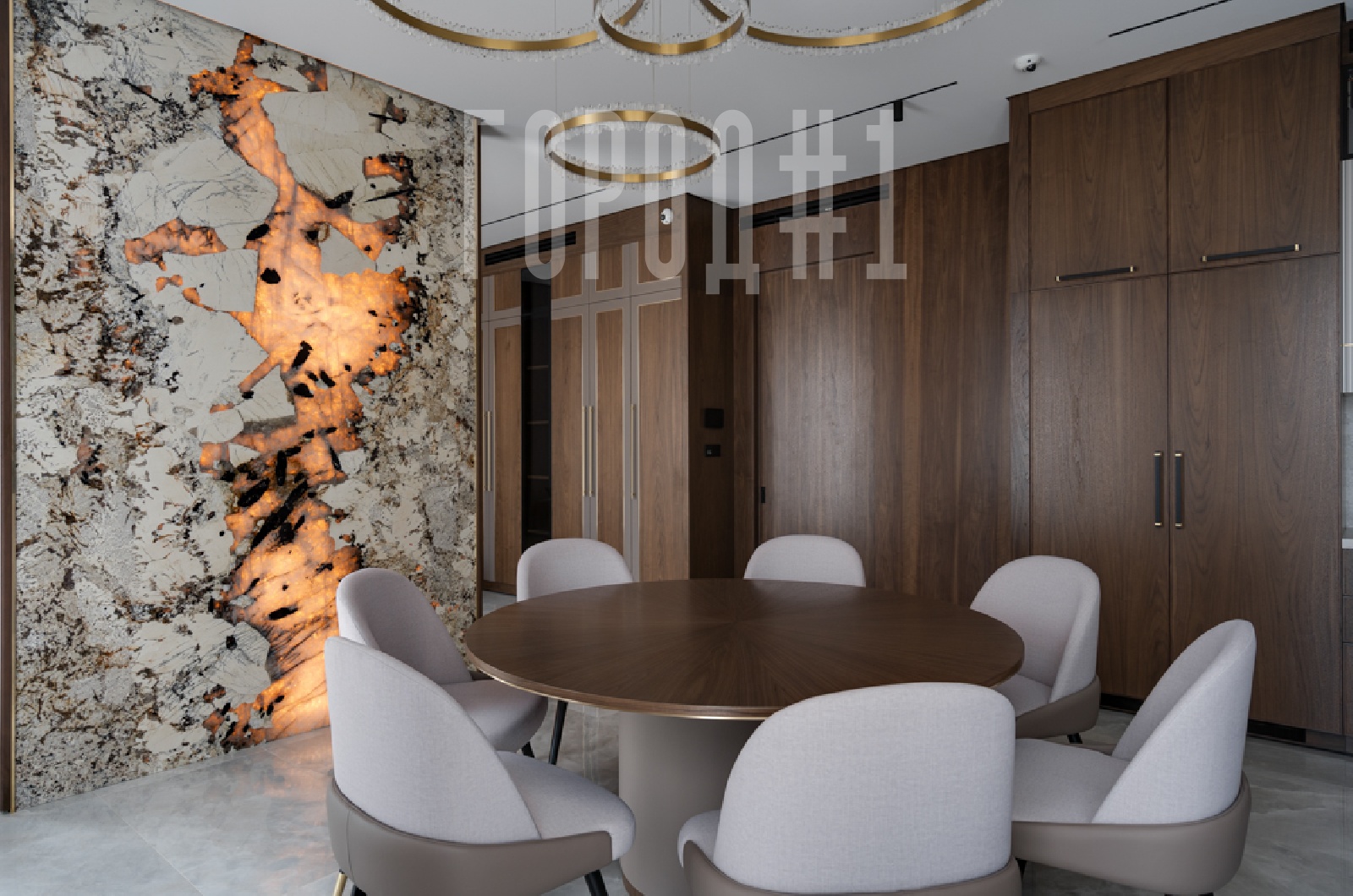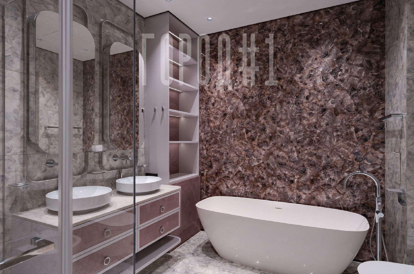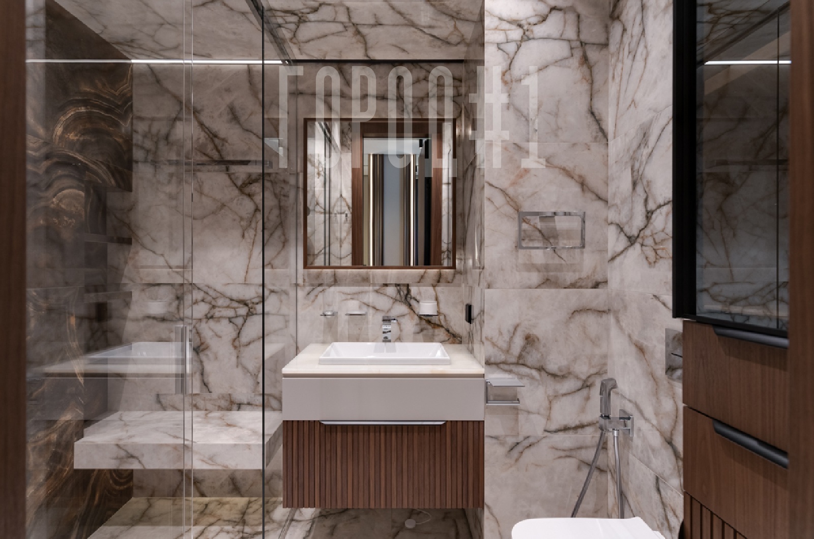 Планировка: кухня-столовая-гостиная, мастер-спальня с с/у и гардеробной, детская с с/у, спальня и кабинет, гостевой с/у, постирочная, гардеробная.