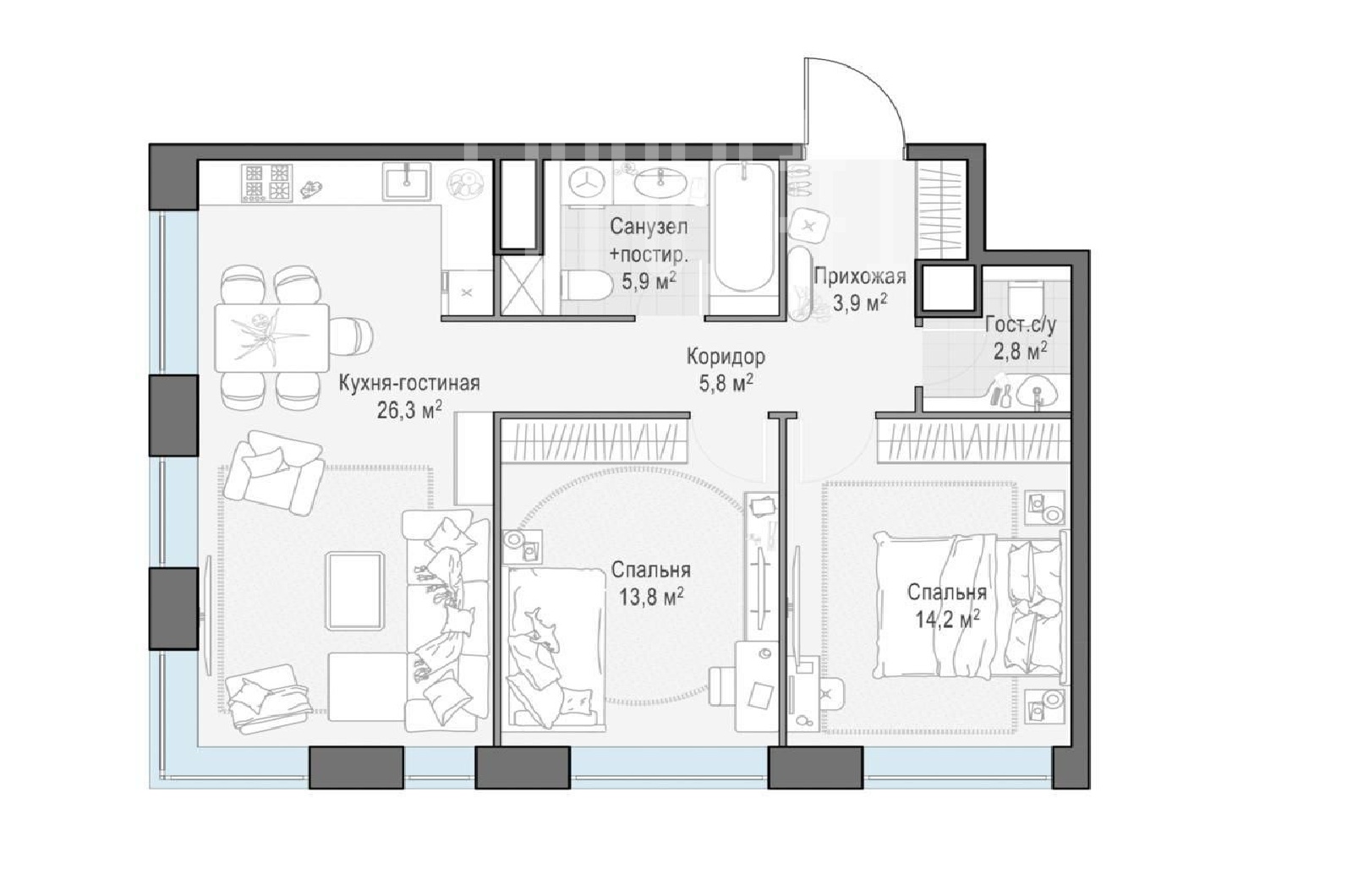 Планировка: кухня-столовая- гостиная, 2 спальни, 2 с/у.